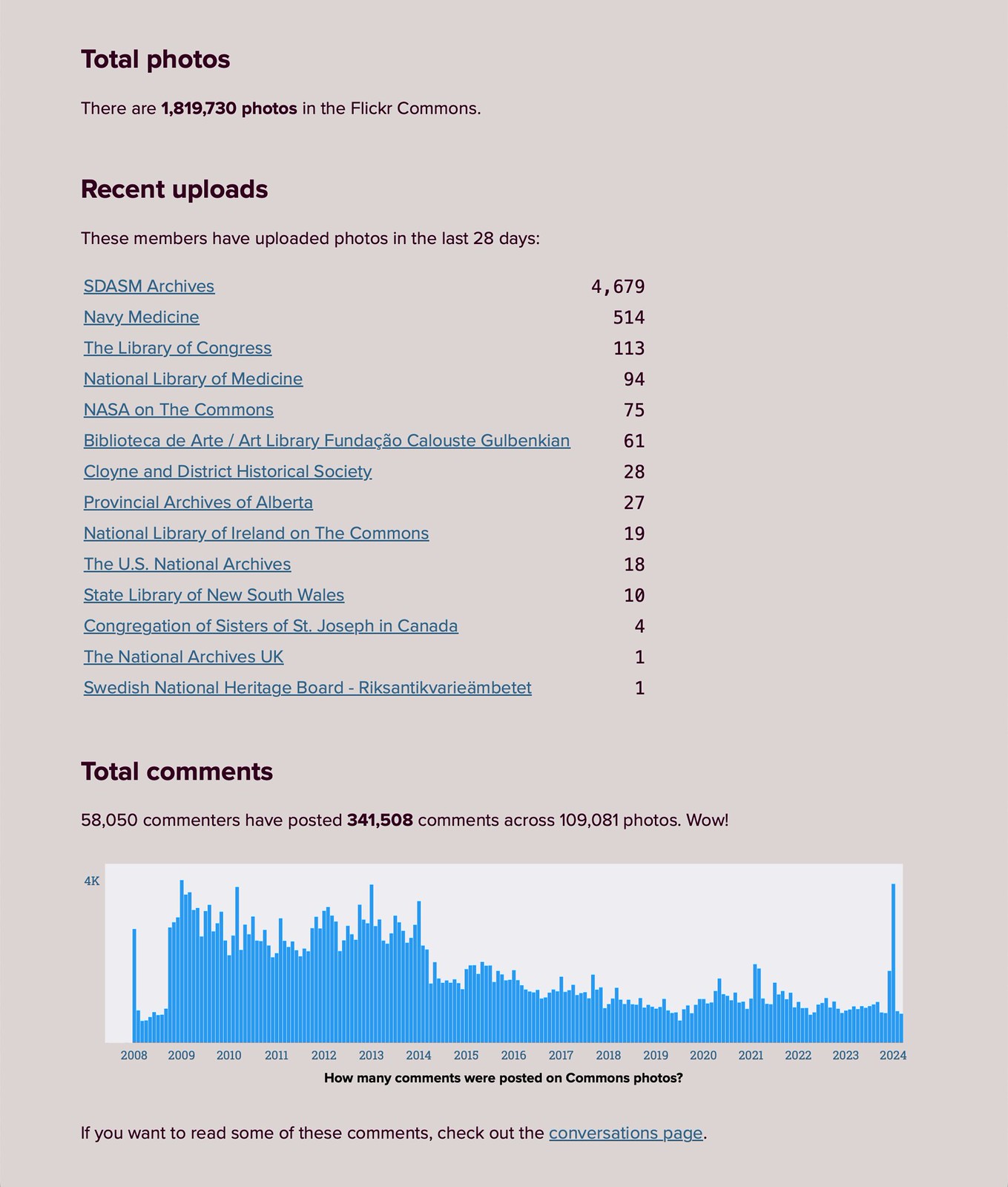 This will involve a new home for registrations of interest, and a smoother onboarding experience for new members as they come on board. Generally, we’re looking forward to new insights into the overall health of the program in the form of better views on activity (the beginnings of which you can see in commons.flickr.org).