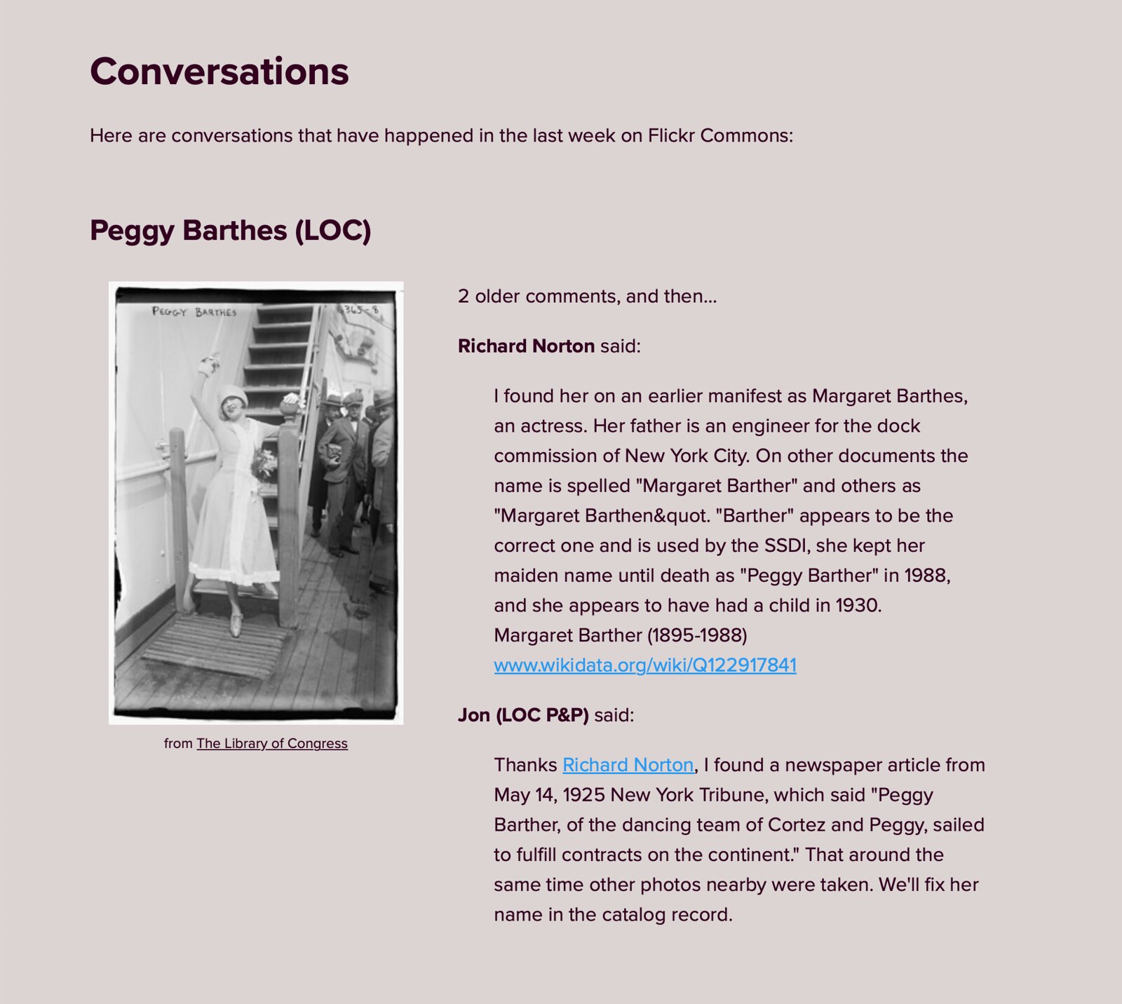 For the first time ever, you can enjoy catching up on the last week’s conversations about photos in Flickr Commons. You’ll see immediately the fantastic community that’s grown up around members like the National Library of Ireland’s photostream, and get to know some of the volunteer researchers inhabiting and contributing their time and detective skills to enrich the Commons.