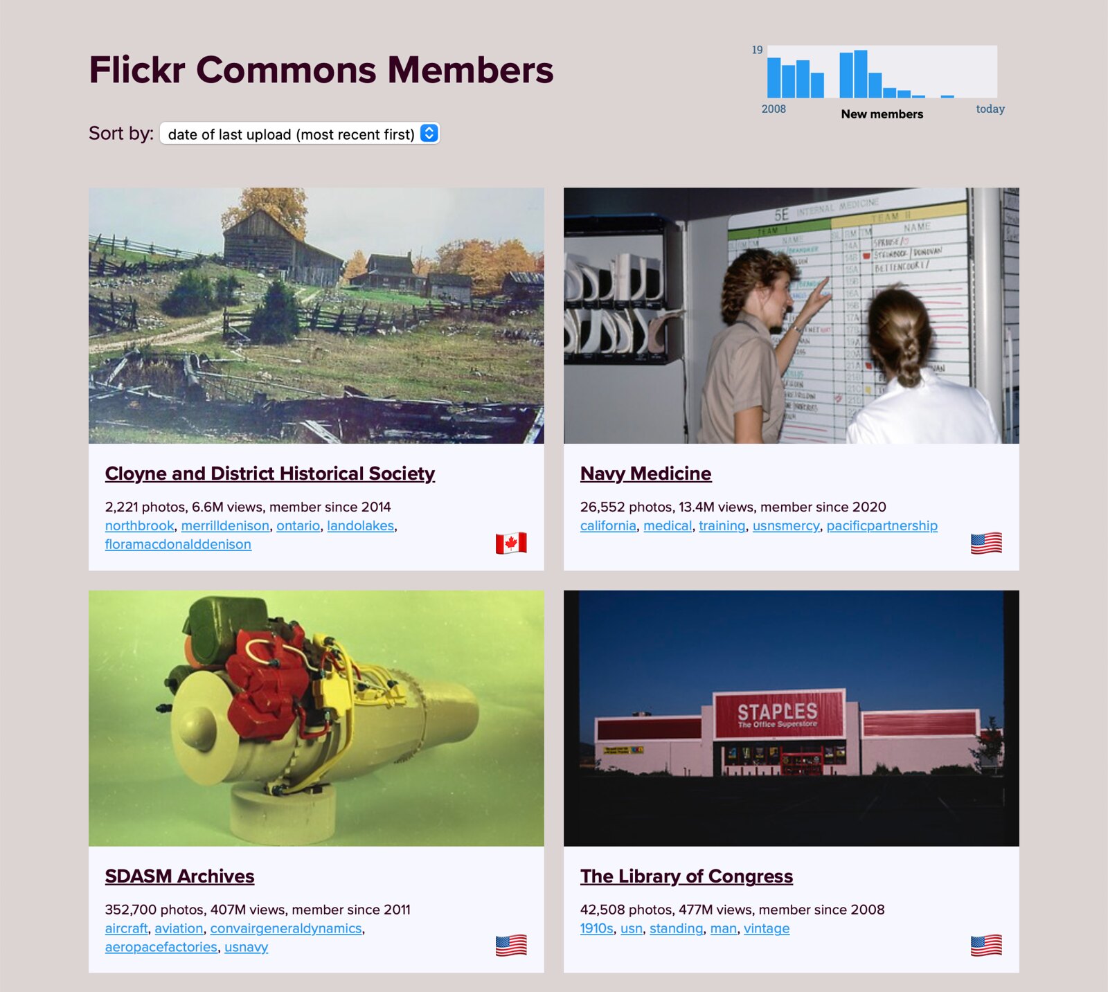 This is a list of all the Flickr Commons members, which you can sort in different ways. We’ve set it to be sorted by the member with the most recent upload, so you’ll see active members at a glance.