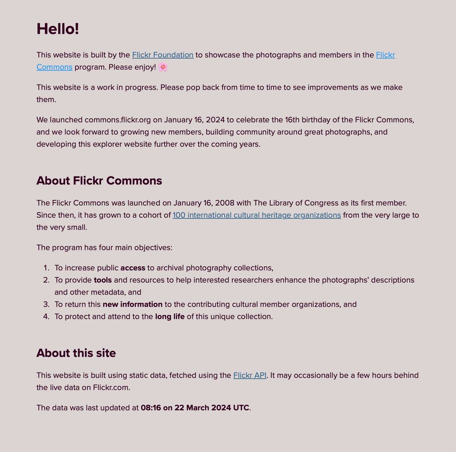 At the Flickr Foundation, one of the goals we set early on when we took over responsibility for running the Flickr Commons program was to build an improved ‘discovery layer’ for the Commons collection.