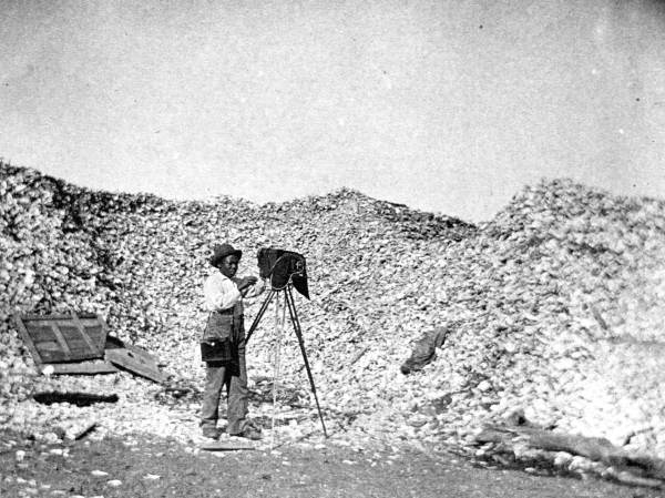 Photographer beside mounds of oyster shells: Apalachicola, Florida, 1895