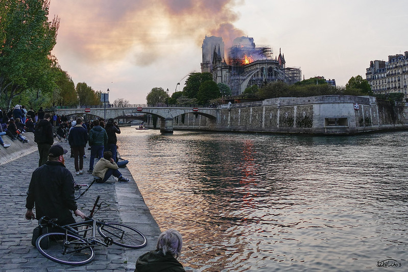 There is an alternative history of the Notre Dame fire, captured not through mainstream media but in the dispersed archives of networked social photography—an often overlooked and underreported lens on the event. Among the pictures gathered by the Flickr Foundation is a remarkable collection of street photographs that offer a fresh perspective (also shared in this post). These images place the fire in context: smoke billows against the backdrop of the Eiffel Tower as seen from Trocadéro; a woman in a fur coat strolls nonchalantly past the boarded-up bouquinistes; a couple steal a glance from their moped; a man abandons his bicycle, supplicating on the banks of the Seine. User-generated social photography expands the event from its mass-reproduced, singular, fixed perspective, into a multi-dimensional, multi-vocal narrative, that unfolds longitudinally over time.