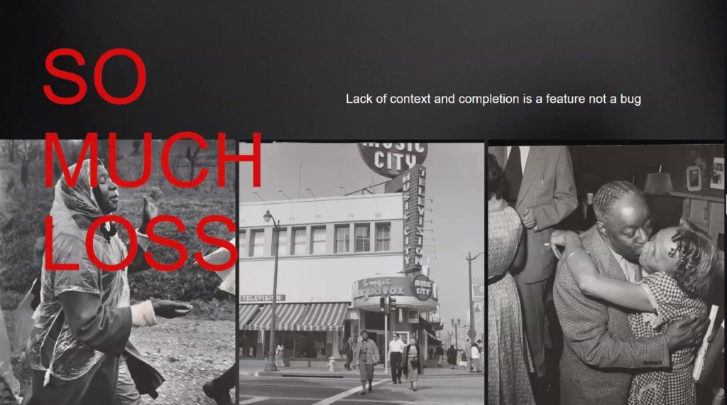 Dorothy Berry, Digital Curator at the Smithsonian National Museum of African American History and Culture, delivered a stunning keynote that has sat with me for days. ‘Looking Back Through Opaque Glasses: What Born Digital Archives Can Learn from Analogue’ offered profound insights (set against stirring photographs) on the imperfect translation of memory from analogue to digital realms. Berry proposed that we view this murky transition as an opportunity to re-examine the digital archive’s purpose and practice.
