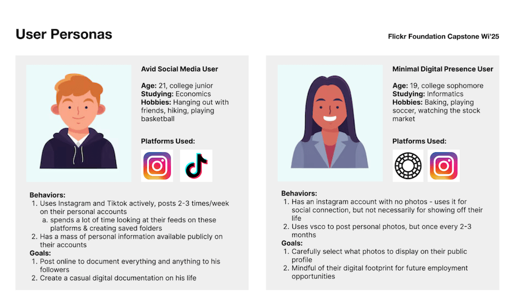 These two user personas were created with the intention of representing two ends of the spectrum within unconscious archiving on social media. On one end, we created the “Avid Social Media User” who lacks intention when posting on social media highlighting a disconnect between digital documentation and digital legacy planning. On the other end, we created the “Minimal Digital Presence User” who is intentional about their social media presence and cares more about photo sharing as a personal repository. Both sides of these personas highlight that anyone can be practicing archival work unbeknownst to themselves.