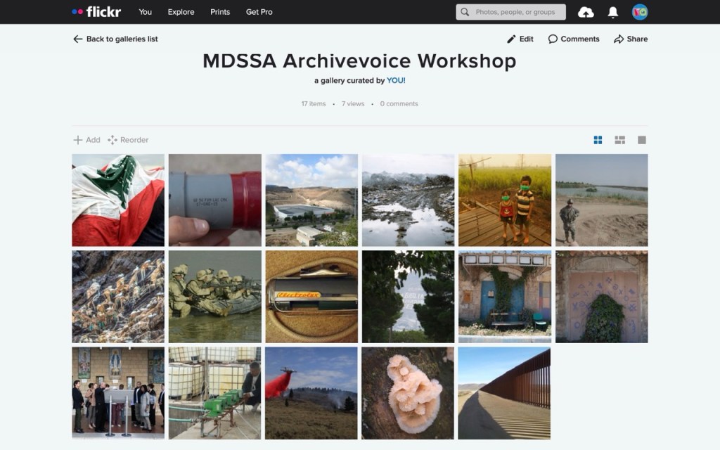 The workshop consisted of three parts. First, I gave an overview of the Archivevoice method and its conceptual background. Next, I did a walkthrough of the Flickr.com website, highlighting the various features of the platform that could be used to tailor their search to make it relevant for their research parameters. This included the various filtering and search parameters, looking at image captions and descriptions, copyright licensing, geodata, tags, comments, albums, and groups. Next, I offered some prompts related to the themes of the MDSSA project and gave the researchers time to browse the collection of photos on Flickr. I collected the photos of interest and assembled them into a Flickr gallery.