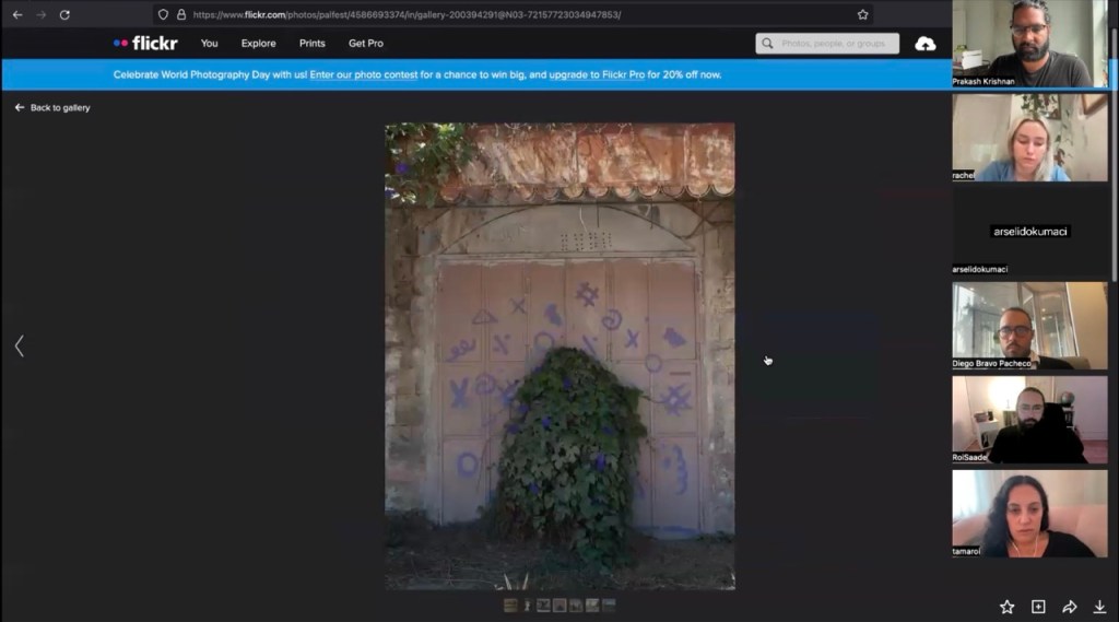 Other researchers took a different approach to searching in the Flickr archive. For instance, Tamara noted how she first looked up her own name out of curiosity. “And then I ended up on this Palestine Festival of Literature page that I’ve photographed before. But then I saw this that said ‘Shops forced to close becoming overgrown’… it’s in Hebron, the shops in the old city are mostly closed in that area.” This photograph also had aesthetic links to Roï’s project which includes similar portraits of abandoned buildings covered in overgrowth.