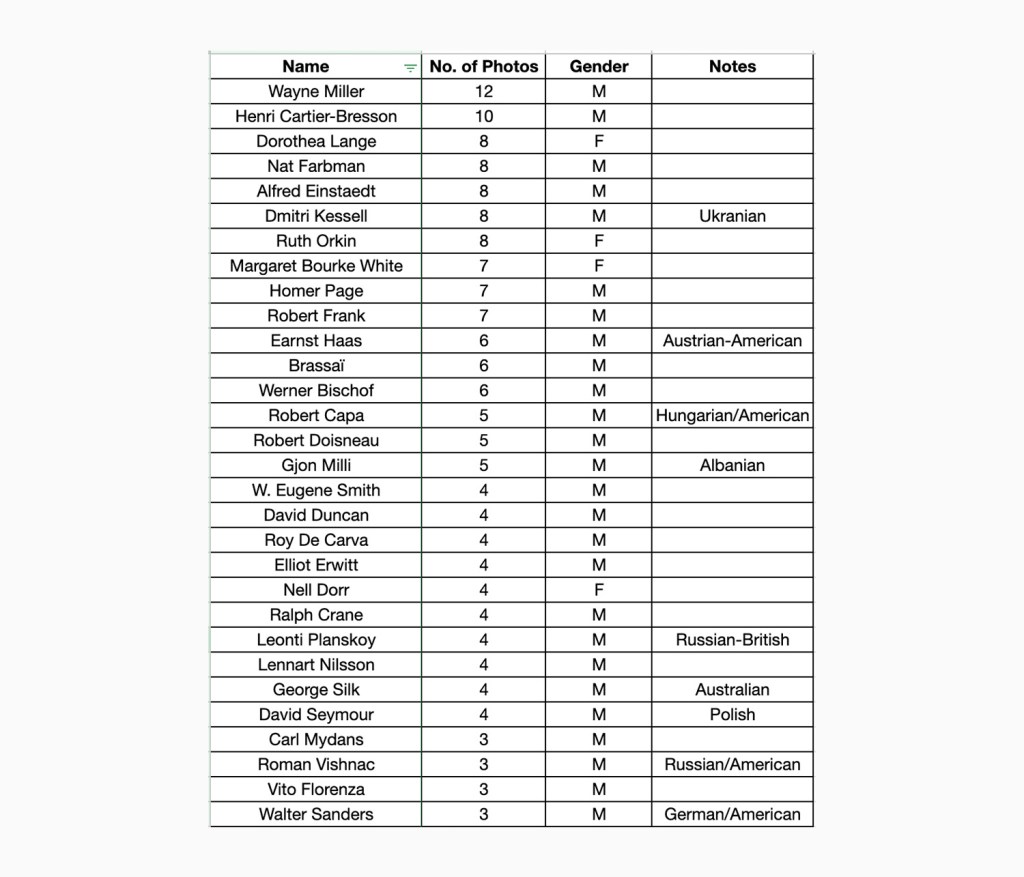 - Among the top 10 most featured photographers were three women (Dorothea Lange, Ruth Orkin and Margaret Bourke White).