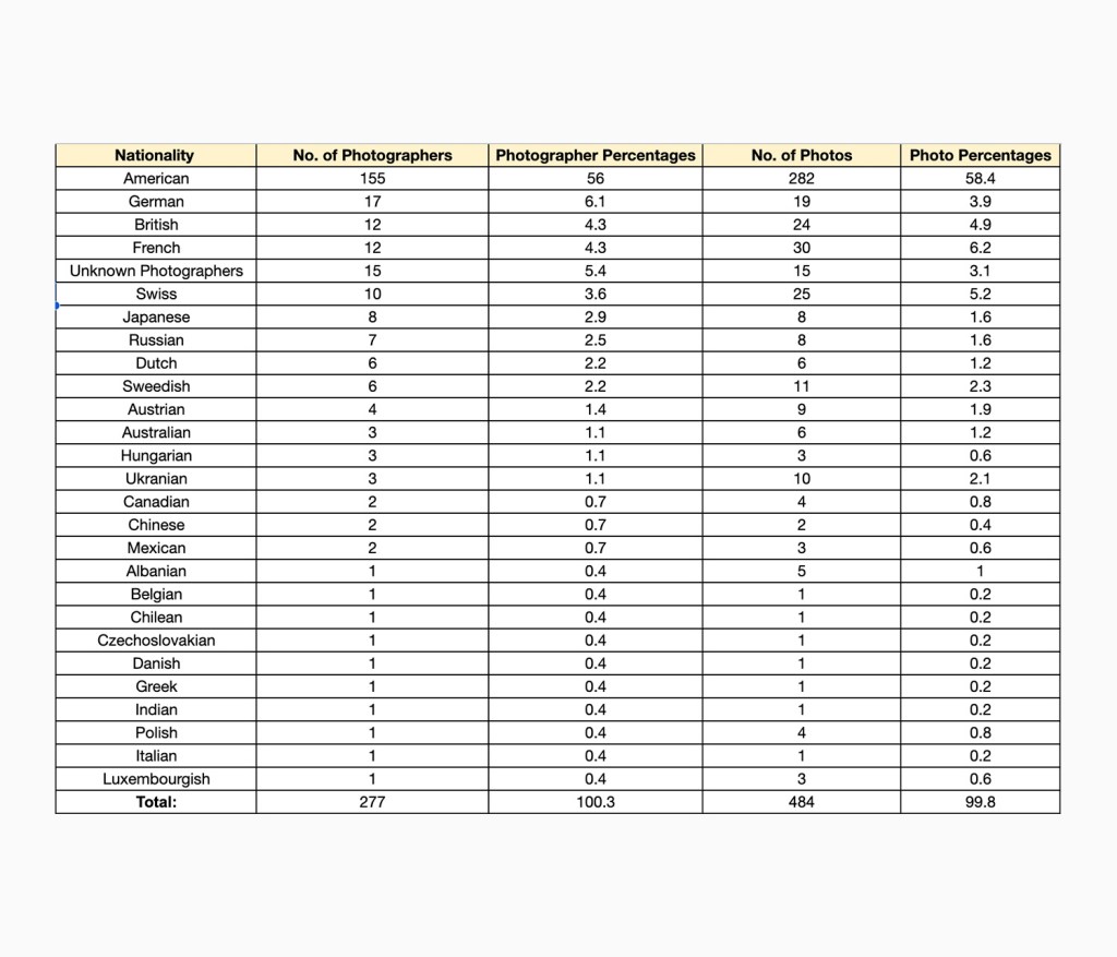 Out of 251 known photographers, 155 were American. That is 56% of the total number of photographers. The most common nationalities that followed were: German (17), British and French (12 each), and 15 photographers were unknown. It is important to note that some of the photographers were multinationals and in these instances their birth nationality was counted. Information on the photographer’s nationalities were collected by searching up their name on the internet and looking for credible sources.