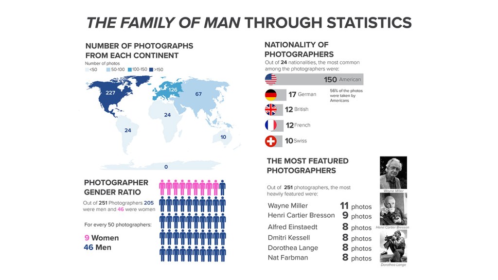 Out of 484 images depicted in The Family of Man 30th Anniversary Edition (1986), 220 are from the USA. That’s 46% of all the photos. The most heavily featured countries after America were: France (32 images), Germany (21 images) and England (15 images). All in Europe. Compared to America’s 46%, France, the runner up, makes up only 7% of the total number of images.