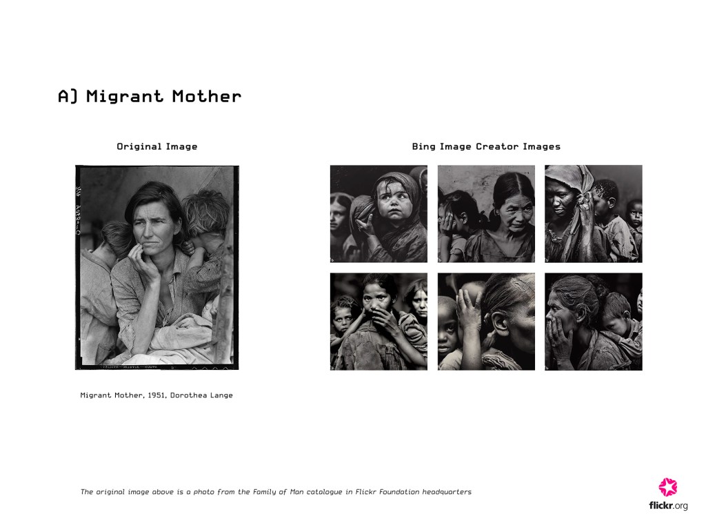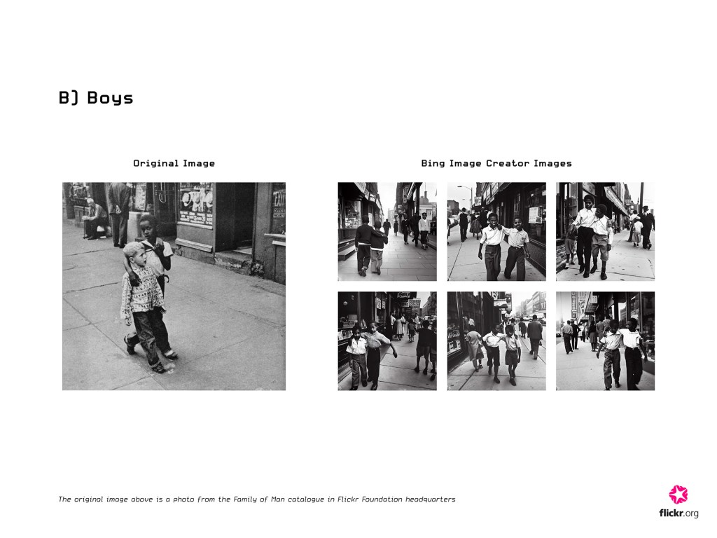 These findings aren’t concrete, but suggest possible hypotheses and areas of image generation technology that we can conduct further research on. We would like to invite everyone to join the Flickr Foundation on this exciting journey, to branch out from A Generated Family of Man and truly pick the brains of these newly introduced machines.