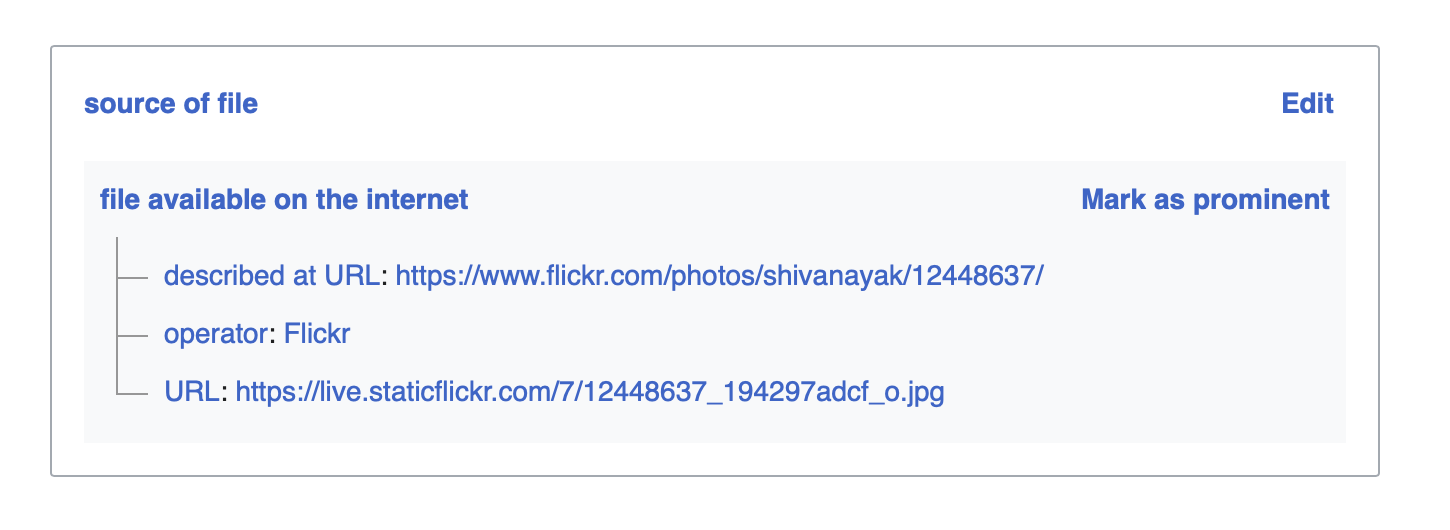 For example, there’s a property called “source of file” which is used to indicate where a file came from. The file in our example has a single statement for this property, which says the file is available on the Internet, and points to the original Flickr URL: