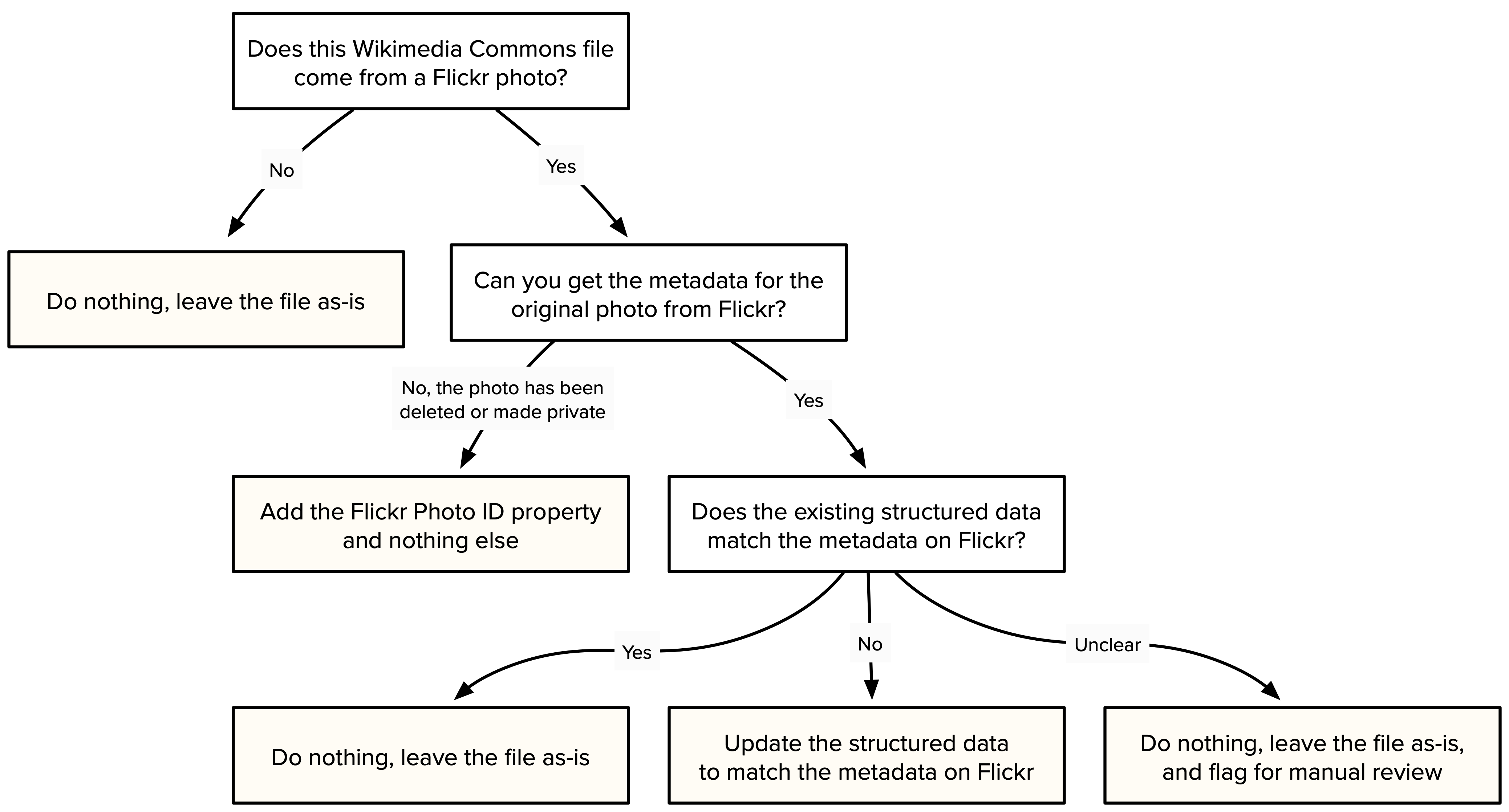 It reuses code from our duplicate detector: it goes through a snapshot looking for any files that come from Flickr photos. Then it gets metadata from Flickr, checks if the structured data matches that metadata, and if not, it updates the file on Wikimedia Commons.